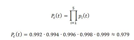 «Система состоит из N = пять частей. Надёжность каждой части изделия характеризуется вероятностью p_i (t) безотказной работы в течении времени t, которая равна:»