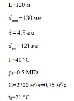 Определить изменение температуры сжатого воздуха и увеличение массового расхода в трубопроводе длиной L, м, если наружный диаметр d, мм, толщина стенки δ, мм, температура воздуха на входе в трубу t1 0С, давление воздуха на входе p1, МПа, расход воздуха G, м3/ч. Температура окружающего спокойного воздуха t0