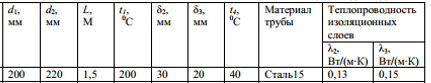 «Металлическая труба с внутренним диаметром d_1 и наружным d_2 длиной l покрыта двумя слоями изоляции, толщины которых δ_2 и δ_3. Температура внутренней поверхности трубы t_1, наружной поверхности последнего слоя изоляции t_4.»