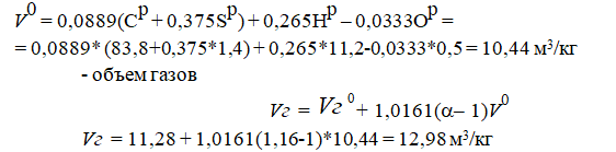 где Vг0 =11,28 м3/кг теоретический объем газов, принимается по табл.ХI справочника Теловой расчет котельных агрегатов. Нормативный метод.