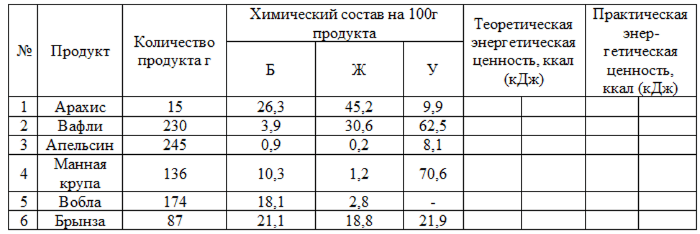 «Рассчитайте теоретическую и практическую энергетическую ценность продуктов на заданное количество продуктов в ккал и кДж.»