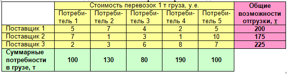 Необходимо осуществить перевозку песка пяти потребителям от трех поставщиков, минимизировав транспортную работу. Заданы потребности поставщиков и складские запасы поставщиков, а также матрица стоимости перевозок 1 т груза от i-го поставщика j-му потребителю (см. табл. 1).