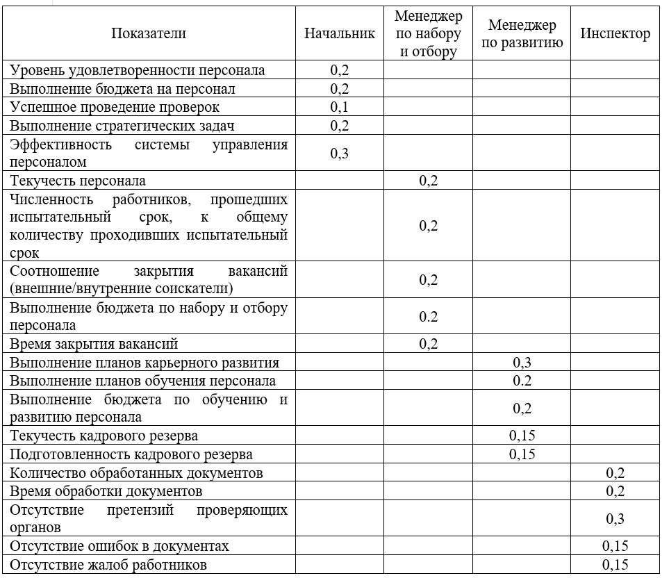 В таблице представлены KPI всех сотрудников кадровой службы организации с удельными весами каждого коэффициента.