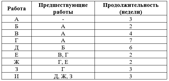 Научно-исследовательский отдел планирует принять участие в крупном проекте по разработке новой коммуникационной системы для самолетов коммерческого назначения. В следующей таблице перечислены работы, их продолжительность и необходимая последовательность выполнения.