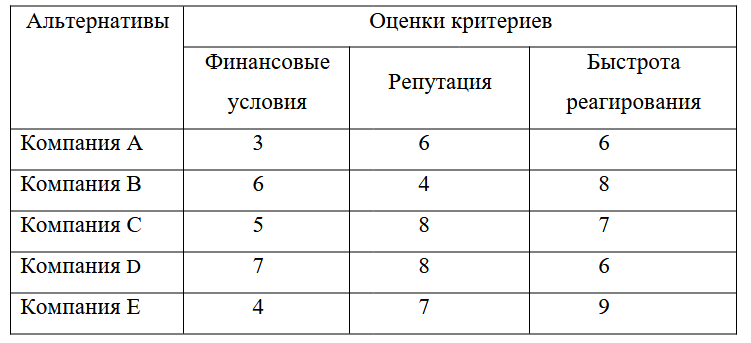 Оценки альтернатив по каждому критерию (чем выше, тем привлекательнее альтернатива) приведены в таблице: