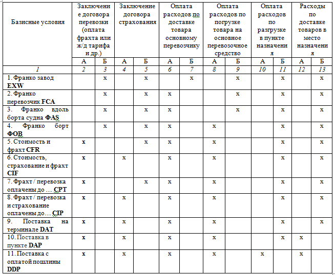 2. Заполните табл. 1, в которой надо отметить знаком «х» обязанности продавца или покупателя в перечисленных базисных условиях.