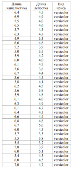 Набор данных содержит результаты измерений ирисов. Iris versicolor, длина чашелистика, длина лепестка.