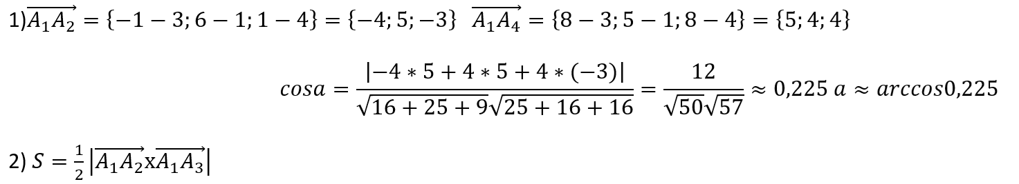 Даны координаты вершин пирамиды А1А2А3А4. Средствами векторной алгебры найти: 1) угол между рёбрами А1А2 и А1А4; 2) площадь грани А1А2А3; 3) проекцию вектора А1А3 на вектор А1А4;