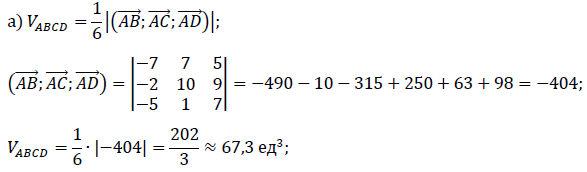«Даны координаты вершин пирамиды:𝐴(3;−5;−2),𝐵(−4;2;3),𝐶(1;5;7)и 𝐷(−2;−4;5) Найти: а)Объем пирамиды;б)площадь сечения проходящего через середину ребра 𝐵𝐶 и вершины 𝐴 и С. в) Косинус угла между ребрами 𝐵𝐷 и 𝐵𝐶;»
