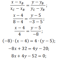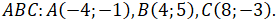 «Даны координаты вершин треугольника ABC:A(-4;-1),B(4;5),C(8;-3). Требуется: 1) вычислить длину стороны BC; 2) составить уравнение стороны BC; 3) найти внутренний угол треугольника при вершине.»