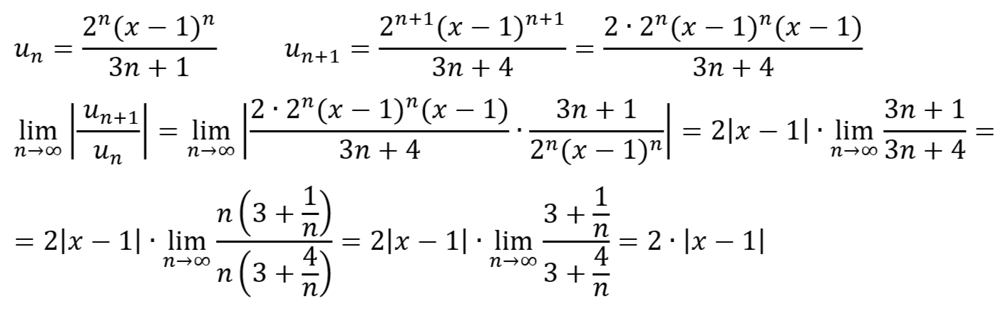 Для данных рядов найти а) радиус сходимости и указать область сходимости ряда; б) выписать первые три члена ряда: ∑_(n=0)^∞(2^n (x-1)^n)/(3n+1) Интервал сходимости степенного ряда найдем с помощью признака Даламбера: