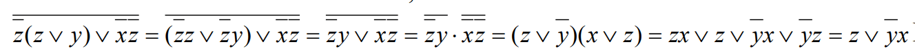 «Для выражения z(z ∨ y) ∨ xz , пользуясь правилами де Моргана, получить ДНФ и упростить её z(z ∨ y) ∨ xz = (zz ∨ zy) ∨ xz = zy ∨ xz = zy ⋅ xz = (z ∨ y)(x ∨ z) = zx ∨ z ∨ yx ∨ yz = z ∨ yx Использовали xx = 0; x ⋅ x = x; x ∨ xy = x; xy = x ∨ y; x ∨ y = x y»