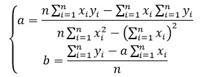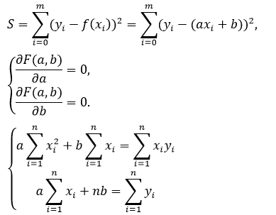 При нахождении приближающей функции в виде многочлена первой степени y=ax+b, коэффициенты выражаются из системы двух линейных уравнений с двумя неизвестными: