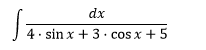 Найдите интеграл: ∫▒dx/(4•sinx+3•cosx+5). Подынтегральная функция рационально зависит от sinx и cosx, применим универсальную подстановку.