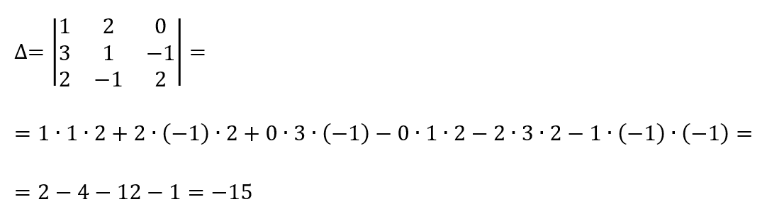 Найти решение системы линейных уравнений: ((1 2 0 |5┤3 1 - 1 |2┤ 2 - 1 2 |6┤ )) Решим систему линейных уравнений по правилу Крамера. Составим и вычислим определитель основной матрицы системы.