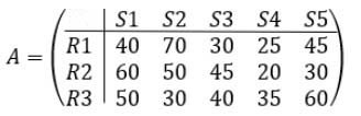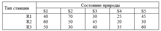 Имеются пять вариантов состояний природы: S1, S2, S, S4, S5. Известны так же четыре стратегии постройки типа электростанции: R1, R2, R3, R4. Результаты расчета экономической эффективности при каждой паре Ri и Sj заданы следующей матрицей: