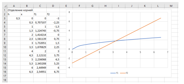 Как видно из графиков функций, корень уравнения приблизительно находится на промежутке [3;4].