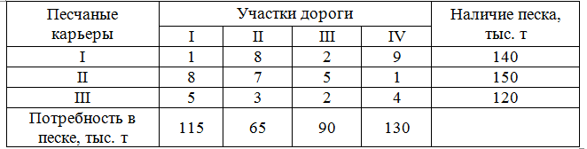 Для строительства 4-х участков дорожной магистрали необходимо завозить песок. Песок может быть поставлен из 3-х карьеров. Перевозка песка из карьеров до участков осуществляется грузовиками одинаковой грузоподъемности. Расстояние в километрах от карьеров до участков, наличие песка в карьерах и потребность песка на участках дороги приведены в таблице: