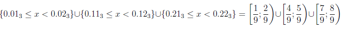 (d) Выясните как по троичной записи числа 𝑥 ∈ [0, 1] установить, лежит ли 𝑥 в 𝐶. (Подсказка: удобно не запрещать записи с "хвостом"двоек.)