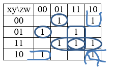 Функция f(x,y,z,w) = {0 1 1 0 1 0 0 1 1 0 1 0 0 1 1 1}