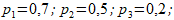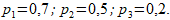 Произведено три выстрела по мишени. Вероятности попадания при каждом выстреле: Найти вероятности следующих событий: нет попаданий, одно попадание, два попадания, три попадания. Составить закон распределения случайной величины – количества попаданий при