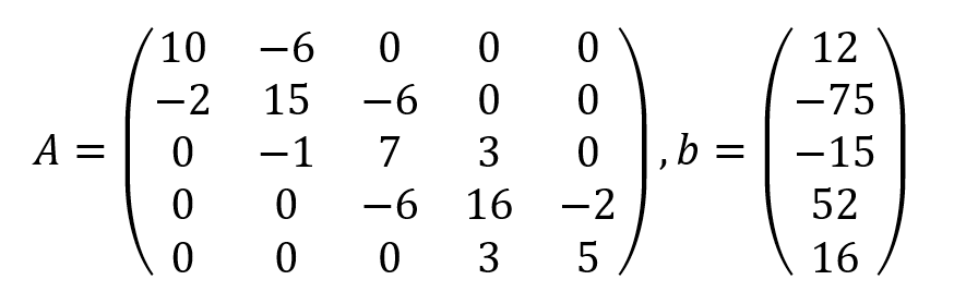 «Решить систему Ax=b методом прогонки A=((10&-6&0&0&0@-2&15&-6&0&0@0&-1&7&3&0@0&0&-6&16&-2@0&0&0&3&5)),b=((12@-75@-15@52@16))»