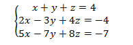 «Решить систему линейных алгебраических уравнений по формулам Крамера: икс плюс игрек плюс зед равно 4, 2 икс минус 3 игрек плюс 4 зед равно минус 4, 5 икс минус 7 игрек плюс 8 зед равно минус 7.»