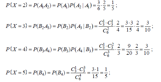 В урне 3 белых и 3 черных шара. Из урны последовательно вытаскивают по одному шару, пока не будет вытащено два белых шара. X — число вытащенных шаров.