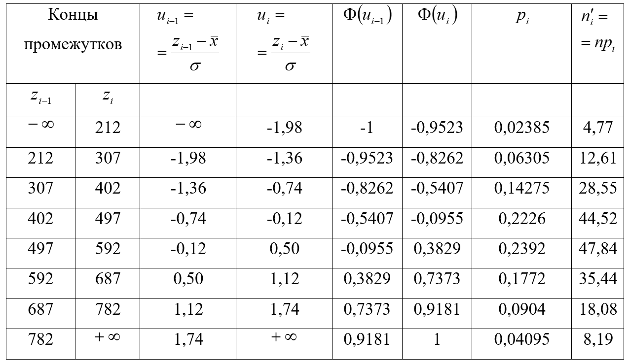 Выдвинем гипотезу о том, что распределение генеральной совокупности подчинено нормальному закону с параметрами a=514,9 и =153,19. Проверим эту гипотезу по 2 - критерию Пирсона при уровне значимости =0,05. Здесь pi=1/2 ((ui )-(ui-1)). Составим расчетную таблицу: