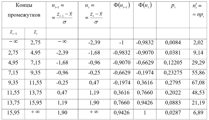 Выдвинем гипотезу о том, что распределение генеральной совокупности подчинено нормальному закону с параметрами a=10,11 и =3,07. Проверим эту гипотезу по 2 - критерию Пирсона при уровне значимости =0,05. Здесь pi=1/2 ((ui )-(ui-1)). Составим расчетную таблицу: